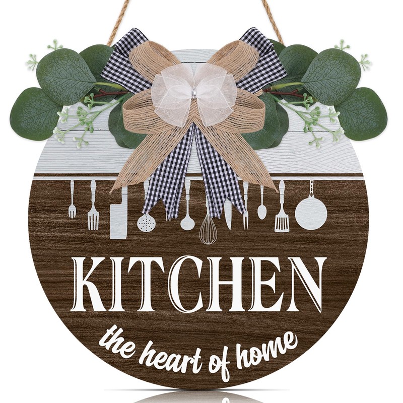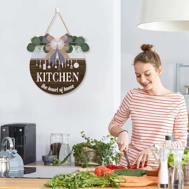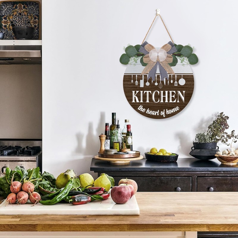 TOARTi Kitchen Wooden Hanging Signs Kitchen The Heart of Home Rustic Wood Sign Round Wood Hanging Decor with Ribbon Bow and Artificial Green Leaves Farmhouse Style Wall Art