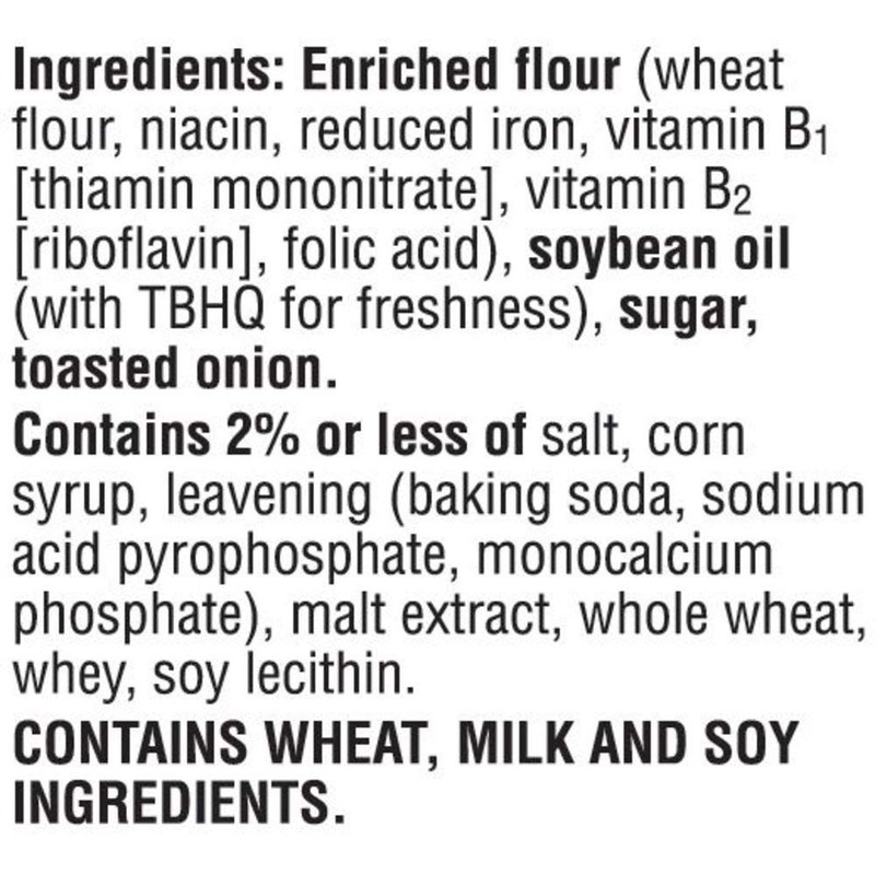 - Includes 1, 8-ounce box of ready-to-eat Toasteds Savory Onion Crackers; Packaged for freshness and great taste