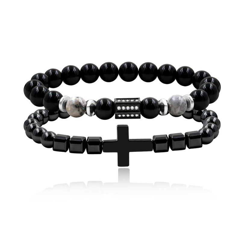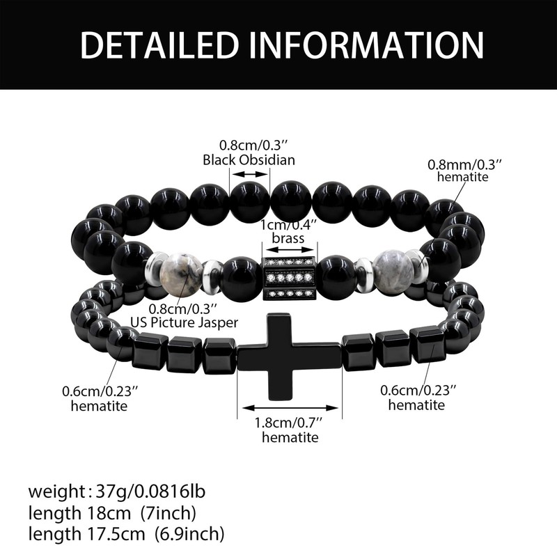 - 1.Design: This set features two natural stone beaded bracelets, each crafted to symbolize faith and spirituality. The prominent cross charm at the center serves as a meaningful focal point, making these bracelets a nice choice for Father's Day or any occasion that honors strength, faith, and belief.