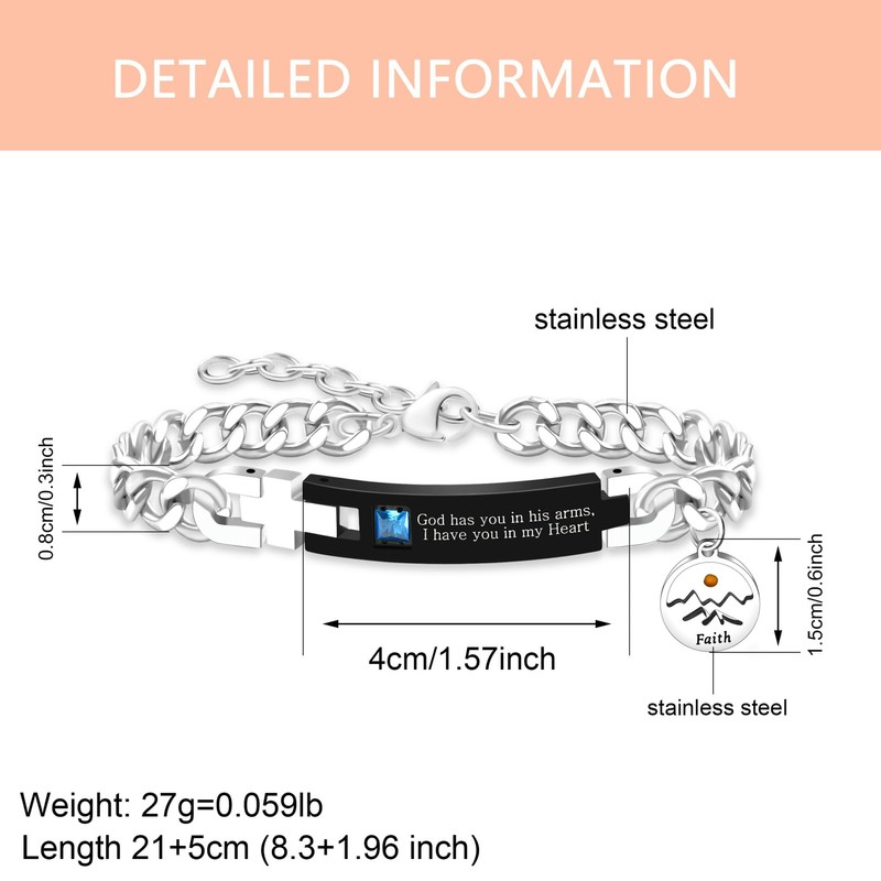 - 【Design】: Featuring a platinum plated stainless steel Cuban chain, this bracelet includes a meaningful mustard seed charm and a black engraved plate accented with a sparkling blue zircon, symbolizing faith and hope.