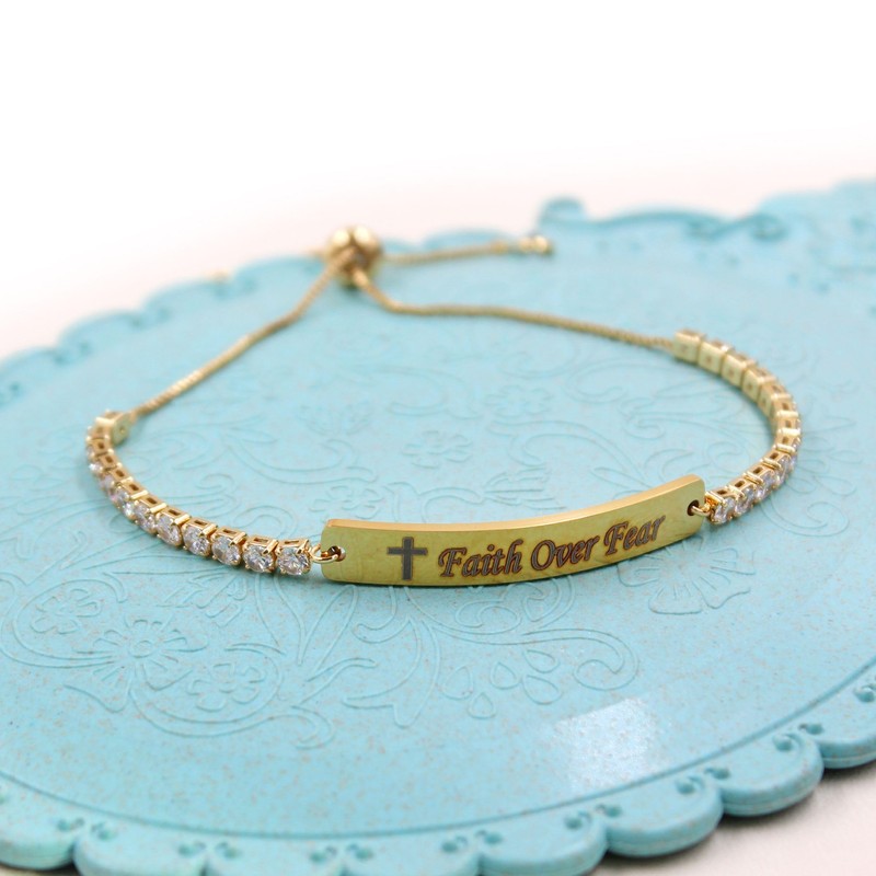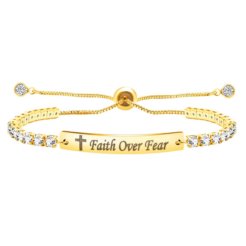 Tobestu Stainless Steel Plate Engraved Cross and Faith Over Fear Tennis Bracelet with Adjustable Bolo Clasp - Gold Plated Inspirational Religious Jewelry Y4390