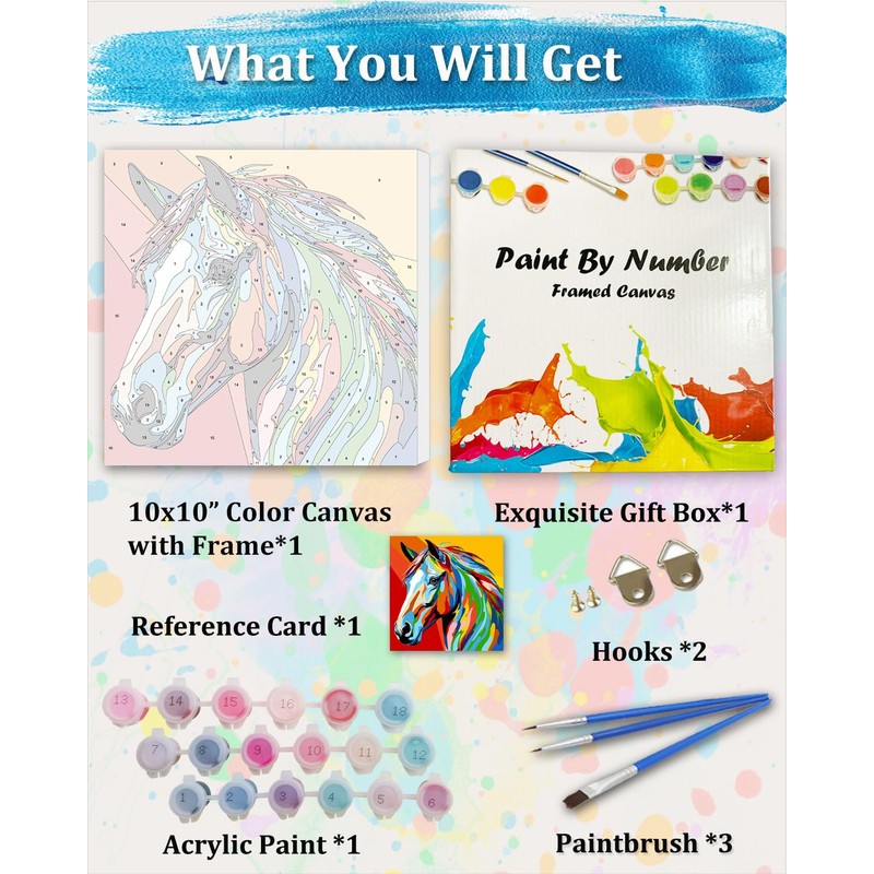 - 【 Ready-to-Hang with Frame】:The horse paint by numbers kit framed canvas of 10x10”strectched canvas makes it easy to display your artwork once completed, with no need for additional framing.