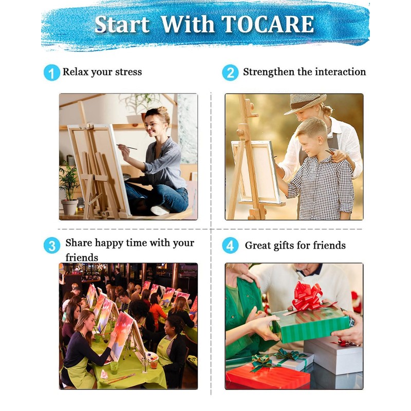 TOCARE Paint by numbers , also known as digital painting and coded oil painting, uses a special process to put the painting into lines and digital symbols. The painter only needs to fill in the corresponding numbered paint in the numbered coloring area to complete the painting. Everyone can create a beautiful masterpiece to proudly share with your families and friends.