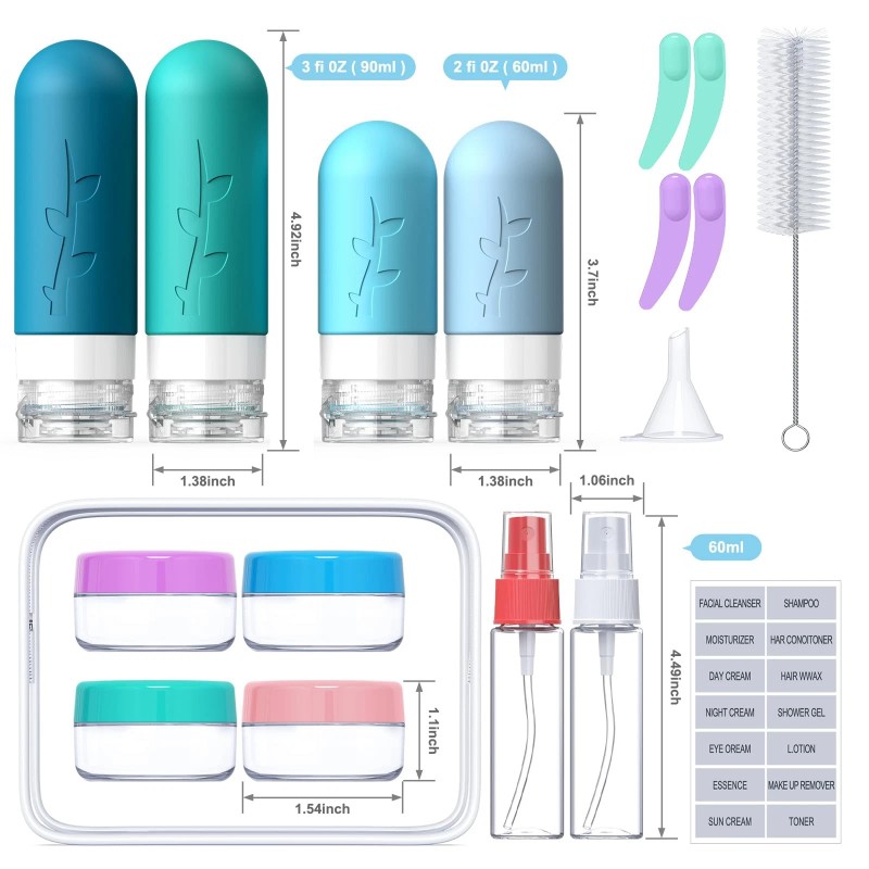 Designed for Travel Accessories: Our 18 pack reusable travel bottles set with 1 waterproof bag, 2 pcs silicone bottles (3 oz/90 ml), 2 pcs silicone bottles (2 oz/60 ml), 2 pcs spray bottles (1.05 oz/30 ml), 4 pcs cream jars (0.35 oz/10 ml), 1 pcs funnels, labels, brush and 2 pcs spatula! Different accessories for your different needs