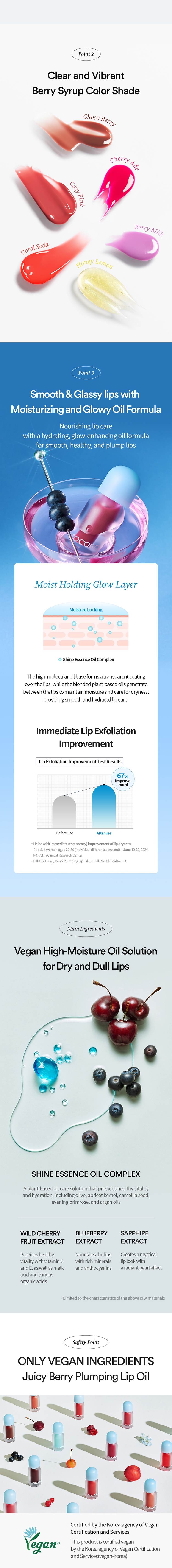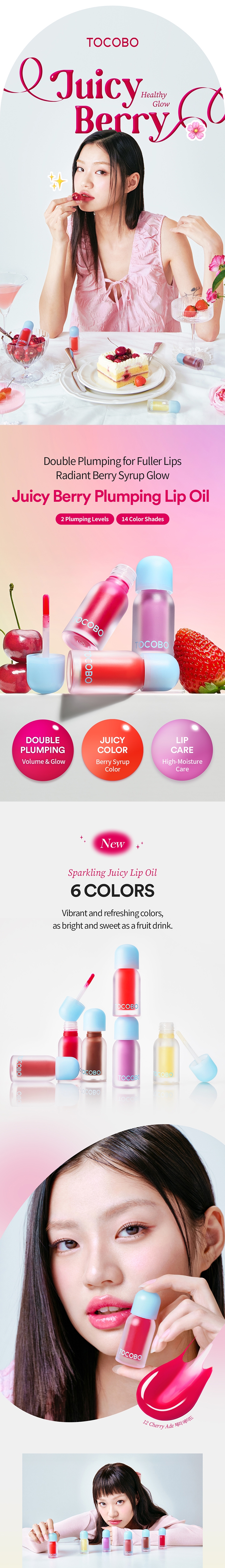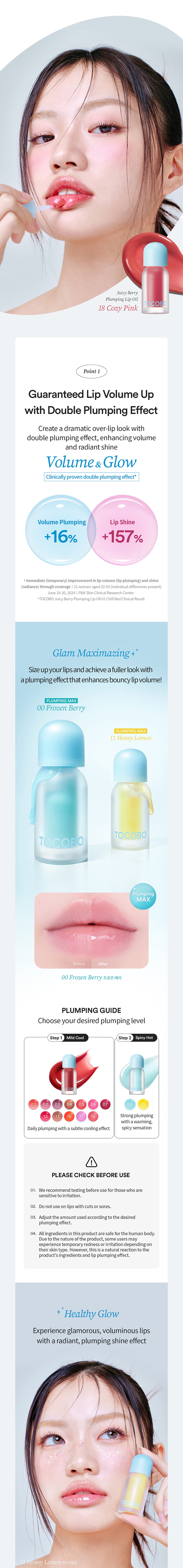 OLIVE YOUNG’s best-selling lip oil. Provides a plump and shiny berry syrup gloss with double plumping. Offers a clear berry color, icy blue pearl, and maximizing plumping effect. 100% satisfaction in lip volume, gloss, and moisturization. Creates dramatic over-lips with double plumping effects for full and shiny lips. Enhances lip size with plumping effects for fuller lips. Creates glamorous and voluminous lips with a radiant gloss effect. Provides healthy, plump, and moist lips without flakes with an oil moisturizing barrier. Certified by the Korea agency of Vegan Certification and Services.