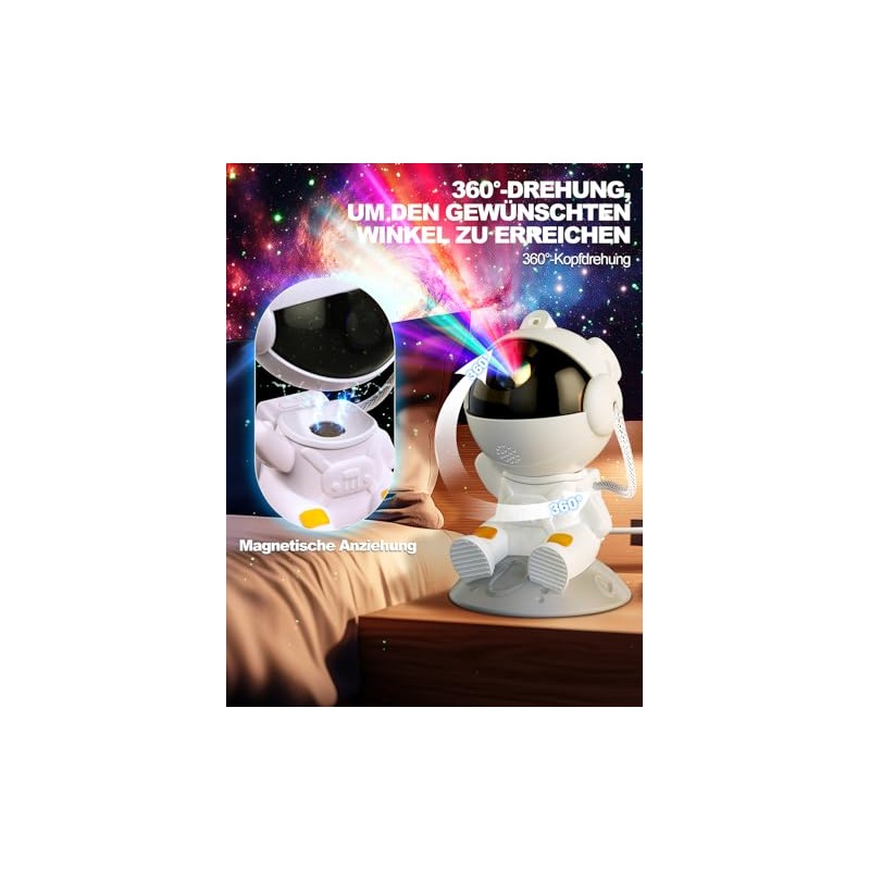 - 360-Drehung und breite Abdeckung: Dieser Sternenprojektor in der Form eines charmanten Astronauten verfgt ber eine magnetische Verbindung zwischen Kopf und K?rper, die eine mhelose manuelle 360-Drehung fr pr?zise Projektionswinkel erm?glicht. Mit einer gro?en Abdeckungsfl?che von bis zu 30 Quadratmetern verwandelt er jeden Raum in ein atemberaubendes kosmisches Schauspiel, perfekt, um sowohl in kleinen als auch in gro?en R?umen eine fesselnde Atmosph?re zu schaffen