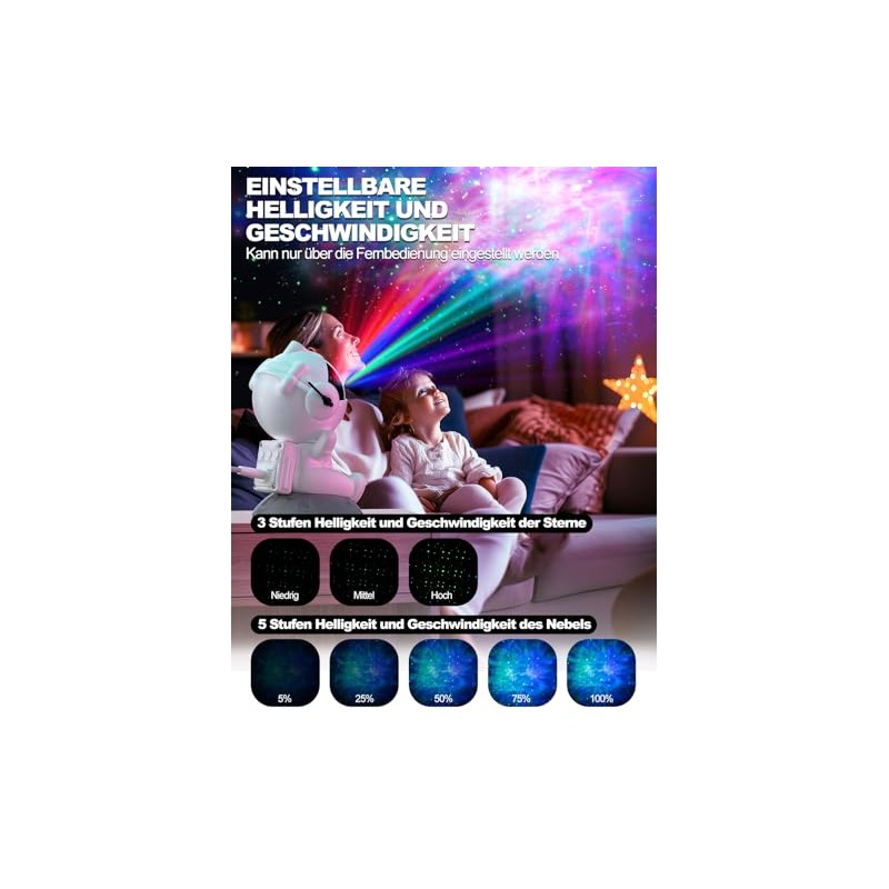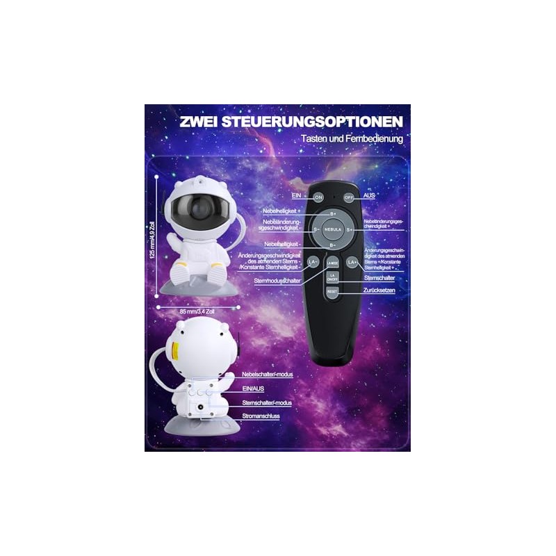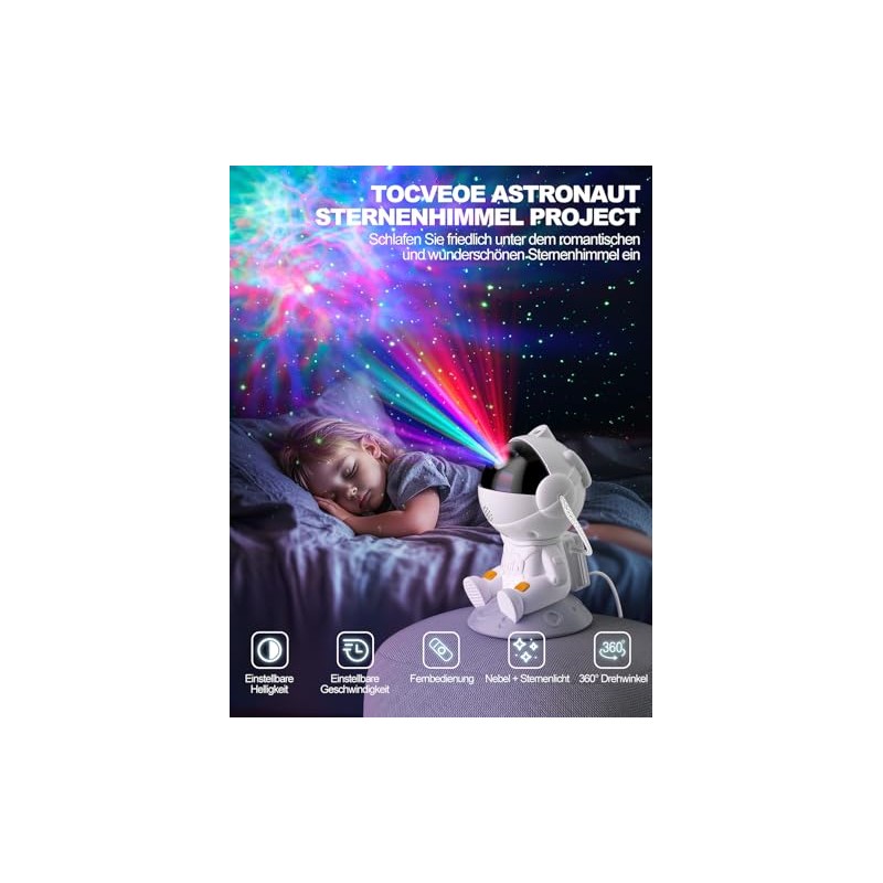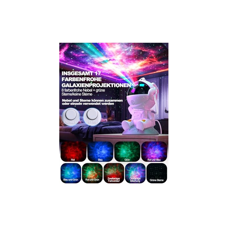 - Wundersch?ne Lichteffekte: Tauchen Sie mit unserem Astronaut Sternenhimmel Projektor mit 8 faszinierenden Nebeleffekten und funkelnden grnen Sternen in den Kosmos ein. Egal, ob Sie eine statische Anzeige oder einen beruhigenden Ein- und Ausblendeffekt bevorzugen, er bringt ein galaktisches Abenteuer in Ihr Zuhause. Perfekt zum Entspannen, Meditieren oder zum Schaffen einer fesselnden, vom Weltraum inspirierten Atmosph?re