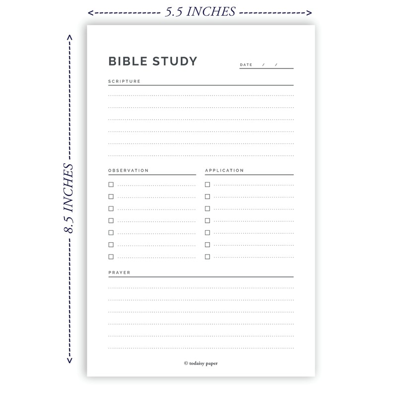 - SIZE AND SPECS: Our Bible Study Notepad is 5.5x8.5 inches. The perfect size to toss in your purse, haul on the go, or move from room to room. Each notepad comes with 50 undated sheets printed on 70 lb uncoated white card stock. The designs are 100% unique and manufactured in the USA. Todaisy Notepads are bleed proof and smudge proof.