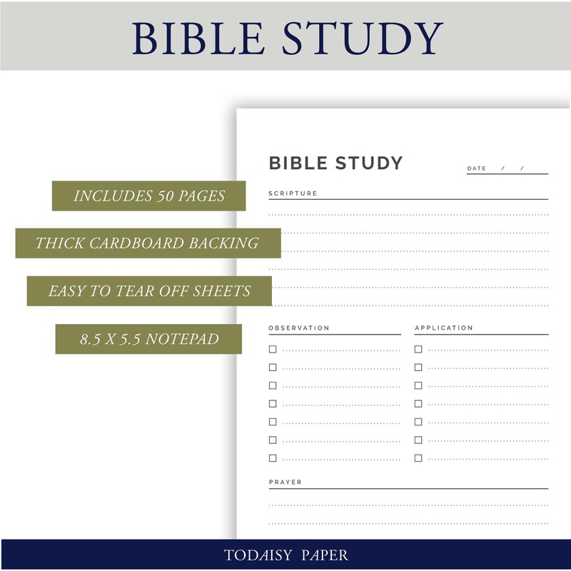 - GET THE MOST OUT OF YOUR BIBLE STUDY: Keep your thoughts organized with this easy tear off Bible Study Notepad. Our notepad follows the SOAP Bible Study Template, includes a spot for everything: Scripture, Observation, Application, and Prayer. A great tool to help students deep dive into individual scripture verses.