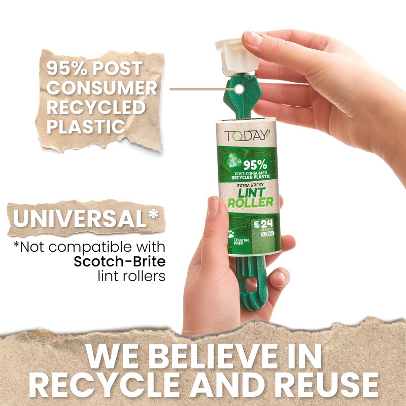Today Today Eco - Lint Rollers 95% Recycled 4 Rolls + Handle + Cover. Post-consume plastic lint remover for cat and dog hair, extra sticky pet hair Remover, 24 sheets