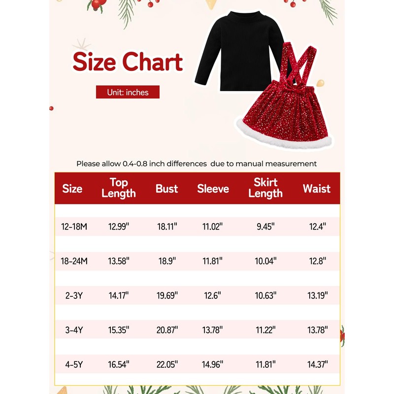 - Size:baby girl christmas dress suspender skirts fit for toddler girls christmas outfit 12-18 months,baby girl fall winter clothes size 3 4t,toddler girls winter dress 5t,please choose a right size for baby girls according to size chart