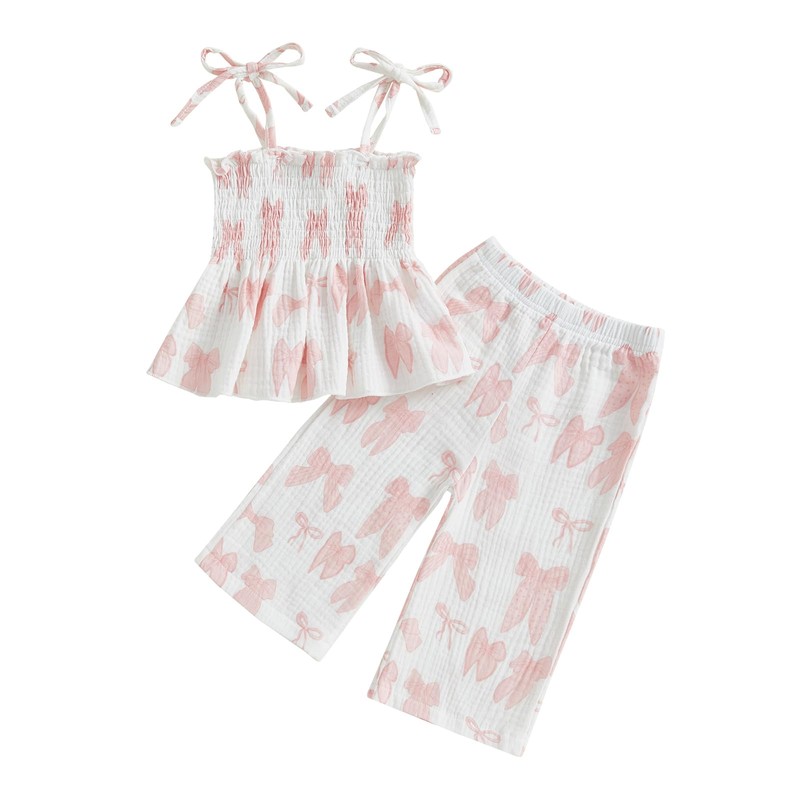Toddler Girl Summer Outfits Bow Print Sleeveless Smocked Tie-up Camisole Loose Pants 2-Pieces Set