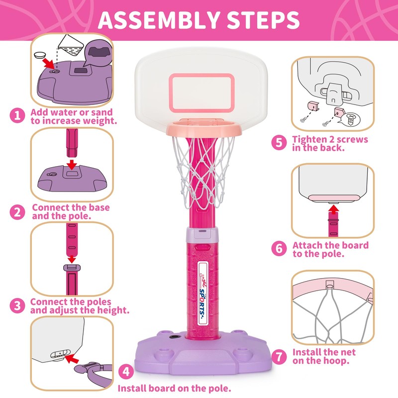 - Easy to Assemble: This kids' basketball goal includes 1 baby basketball hoop, 3 inflatable mini soft basketballs, 1 ball pump, and all needed tools. You can easily complete the assembly and play immediately. Very portable, you can enjoy this basketball toy with family and friends anywhere. Kids can enjoy the basketball game indoor, or start the pool basketball game outdoor, making every boys' little basketball star dream come true!