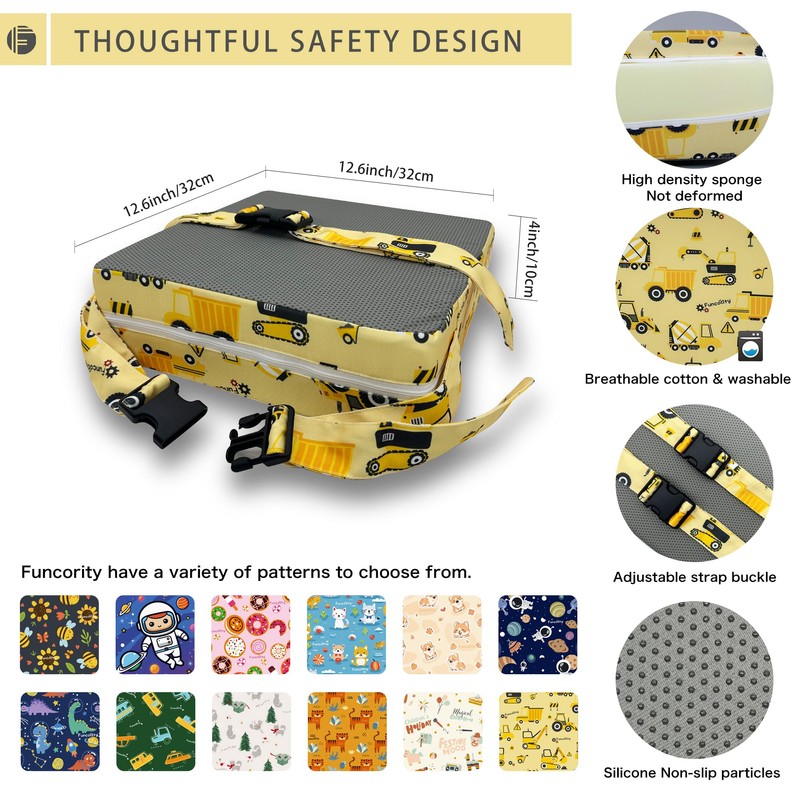 The Funcority booster seat for toddlers is the perfect solution for ensuring your child’s comfort and safety during meals, playtime, or crafting. Designed with a 4-inch high-density foam cushion, it offers the ideal height for kitchen or dining tables. Dual safety straps and a non-slip silicone base provide superior stability, securing the seat on most chairs. The detachable, machine-washable cover ensures effortless cleaning, while vibrant cartoon designs captivate young children. Lightweight and portable, this booster seat is perfect for home or travel.