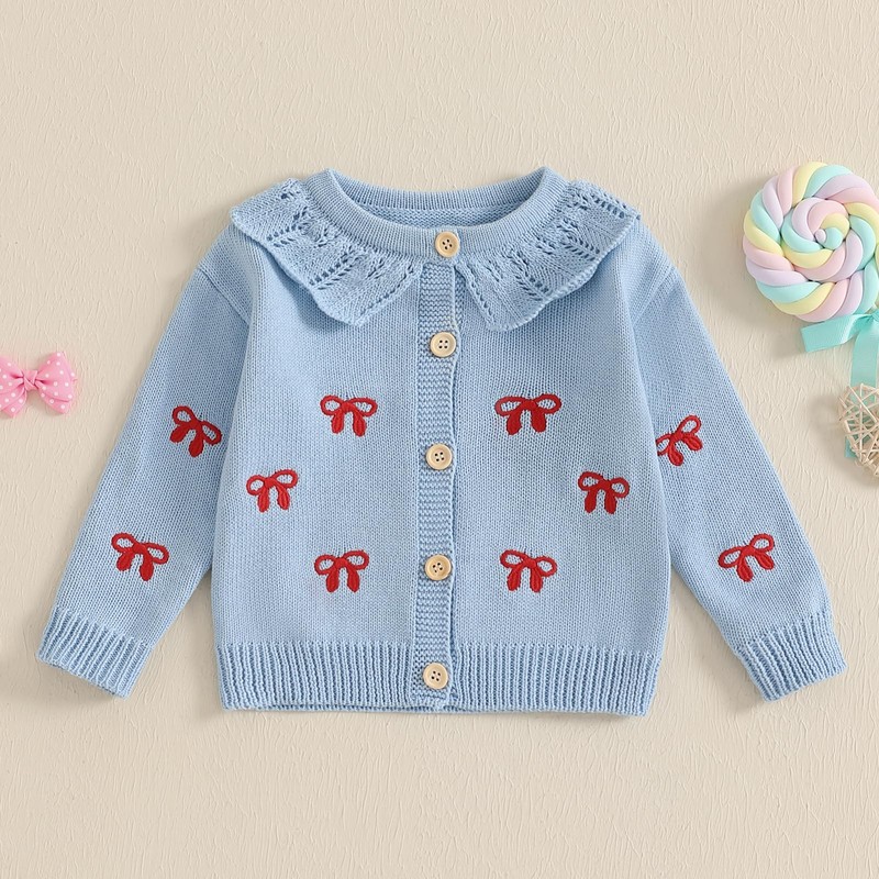 Toddler Girls Fall Knit Cardigans Bow Pattern Button Down Long Sleeve Crew Neck Baby Sweater Jackets (Blue Bow, 3-6 Months)