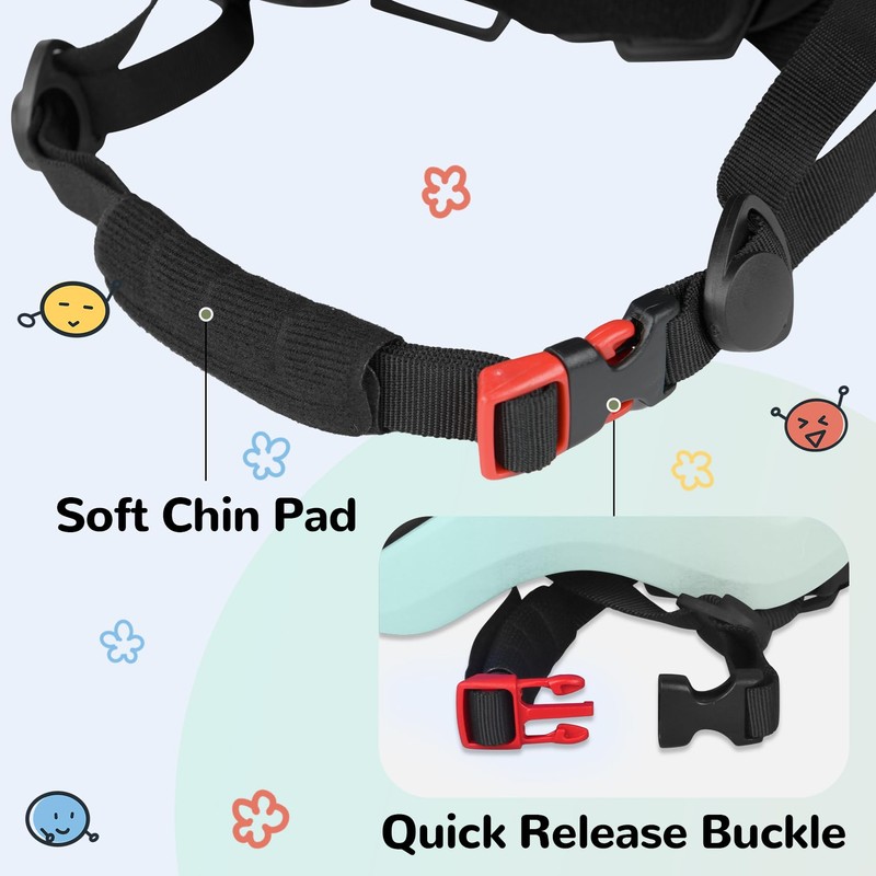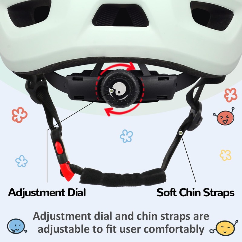 Crank adjustment dial in the back of the helmet and chin straps are adjustable to fit user comfortably from 360-degree. The chin straps are soft, no more worries about that the straps may scratch child's sensitive skin. Straps buckle is easy to fasten and release.