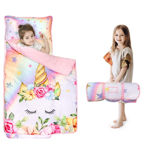 Toddler Nap Mat with Removable Pillow and Blanket, Soft Kids Napping Mats Extra Large Rolled Sleeping Mats for Daycare and Preschool, Travel and Camping, Pink Unicorn Ages 3-7 Years, Girls