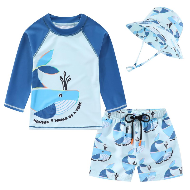 - Toddler Boys’3 Piece Rash Guard Set with cool and stylish Long Sleeve Swim Shirt Top,Sun Hat and cute swim trunks.