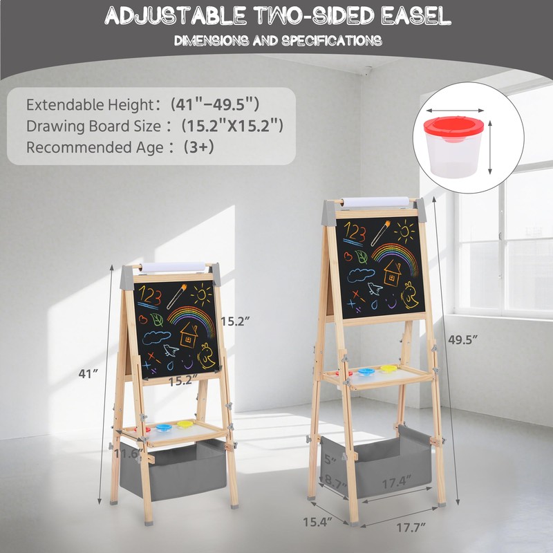 TODEFULL 3 in 1 Adjustable Kids Art Easel Set, Dual-Sided Wooden Art Station w/Magnetic Whiteboard, Chalkboard & Paper Roll, Height Adjustable Standing Painting Easel for Toddlers Ages 3+, Gray