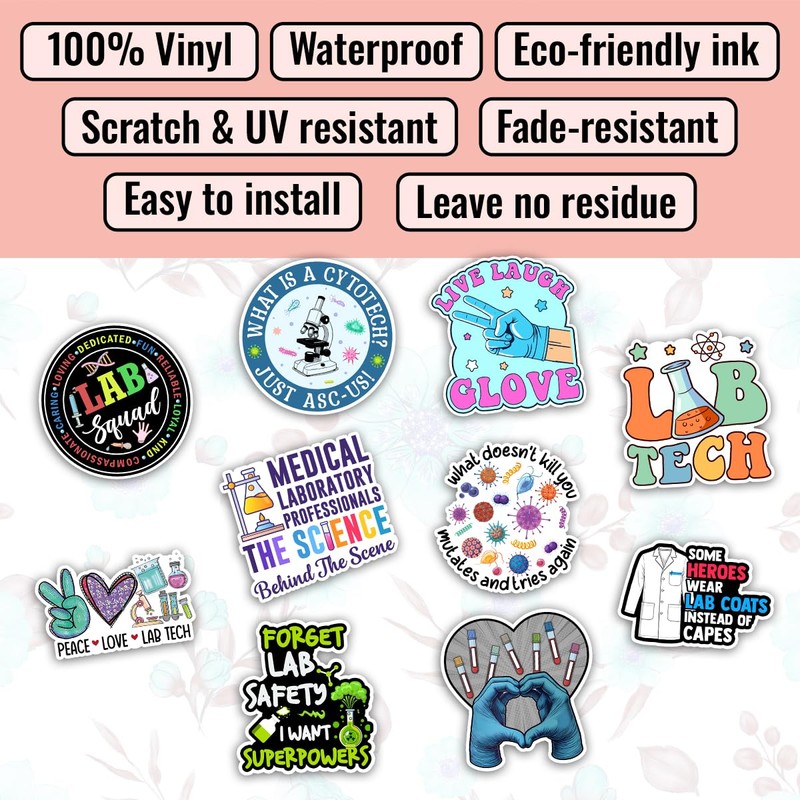 TODOLIA (10Pcs-3in) Lab Tech Sticker Pack, Science Chemistry Biology Medical Laboratory Professionals Sticker, Scientist Lab Week Gift, Decoration for Laptop Planner Tablet Kindle Helmet Vehicles