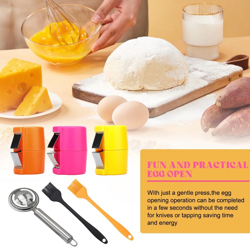 • VERSATILE KITCHEN TOOL This versatile kitchen tool includes 3 handy eggshell openers, an egg separator and 2 oil brushes. This egg cracker is an essential tool for baking, cooking and everyday meals.