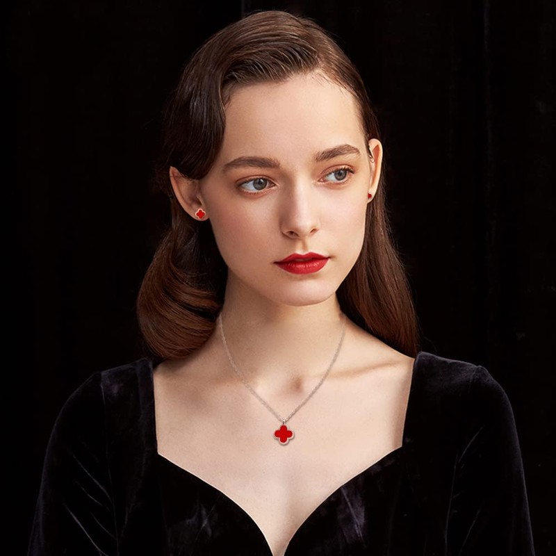 TOFBS Four-Leaf Clover Jewellery Set for Women Girls 18K Rose Gold Plated Double-sided Four-Leaf Clover Pendant Necklace Stud Earrings Bracelet Set Dainty Enamel Jewellery Set (Rose Gold*Red)