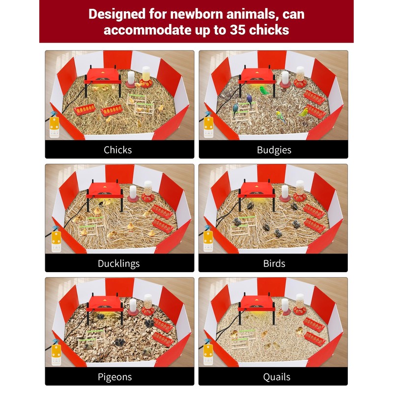 - PERFECT CHICKEN STARTER KIT - GIFANK Chicken Brooder Box include PVC Board*10,Chick Feeder*2,1.3L Chick Waterer*2, Brooding Board*1and Chick Perch*2. The heating Lamp not only provides warmth but also helps stimulate. Chick perch provides more fun for your chicks, GIFANK chick starter kit is the perfect way to provide your chicks with everything they need to grow up healthy.