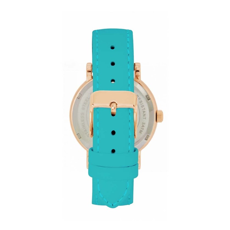 - The ladies case is 38mm in diameter. This rose gold-coloured case comes with a soft turquoise leather strap and matching rose gold buckle. These straps are standard size in length 189mm and 18mm wide which will fit the average lady.