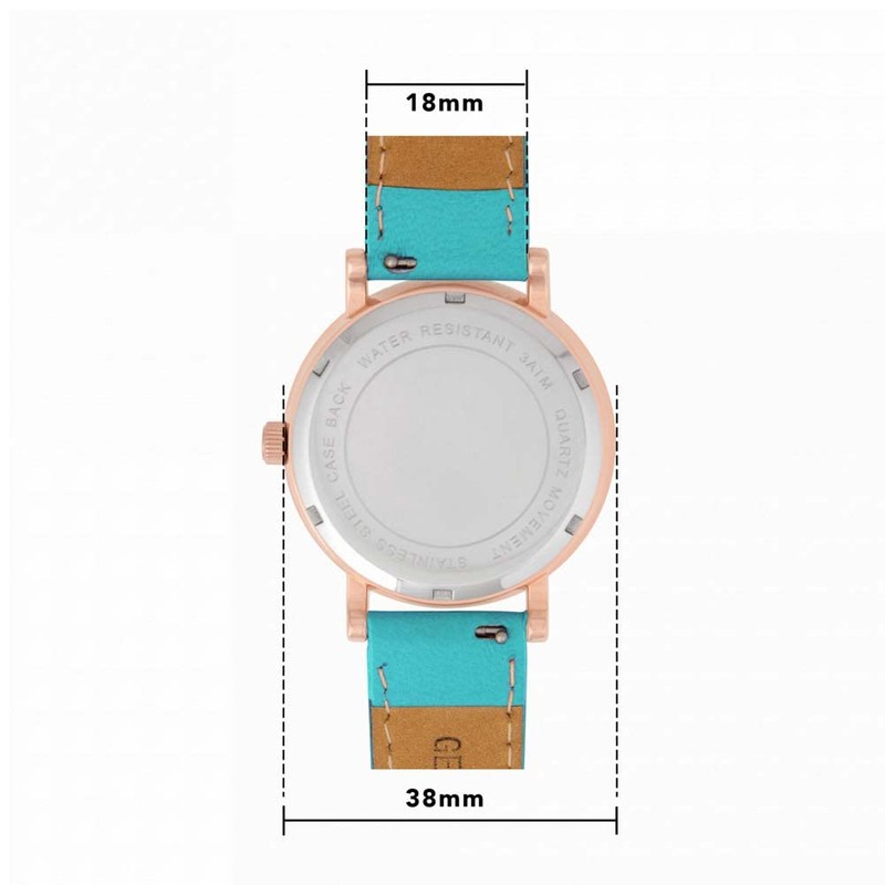 - The ladies case is 38mm in diameter. This rose gold-coloured case comes with a soft turquoise leather strap and matching rose gold buckle. These straps are standard size in length 189mm and 18mm wide which will fit the average lady.