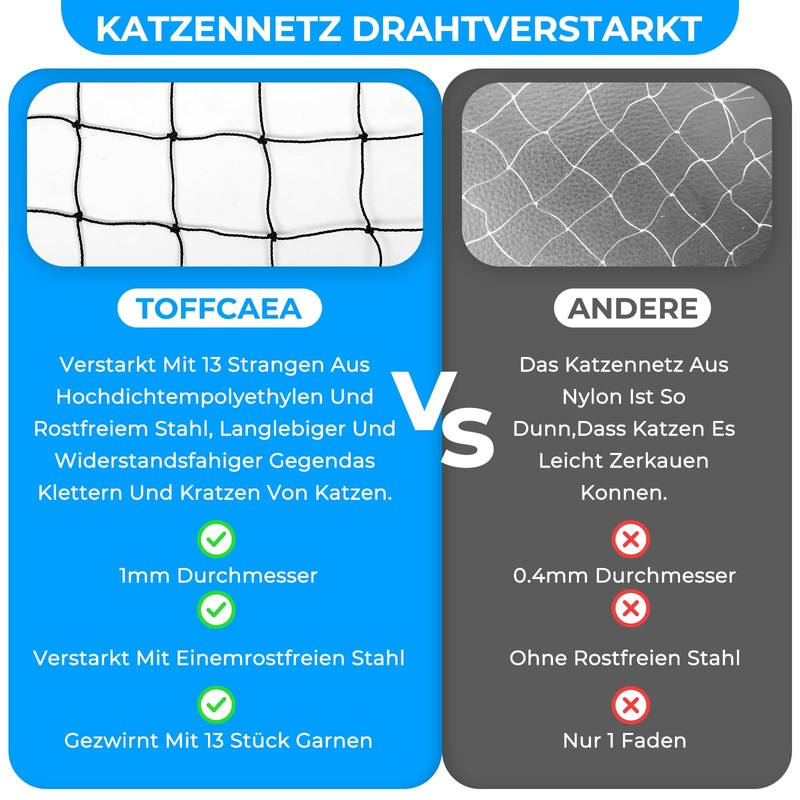 - Extra long service life: made of high-quality, UV-resistant HDPE material, the exceptionally strong balcony protection offers a high durability and tear-resistant thanks to the wire reinforcement. Cold-resistant, stable, deformation-free, longer service life than conventional cat balcony net. Optimal cat balcony protection for your beloved four-legged friends. Perfect for cat safety balcony or cat protection window.