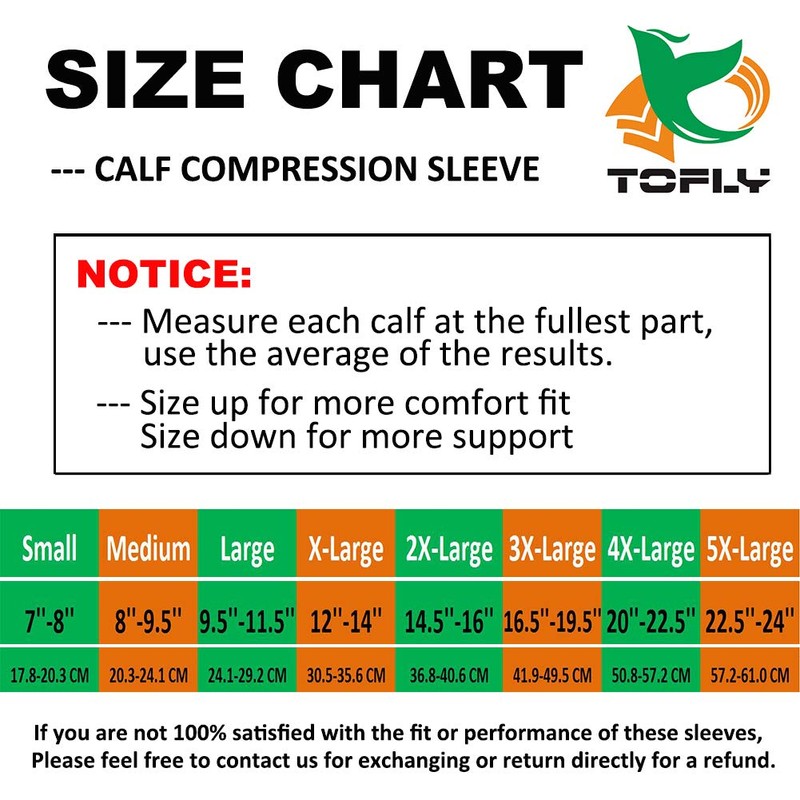 - ★★★ 【GET PERFECT FIT ACCORDING TO SIZE CHART】Measure the thickest part of your calf then compare to the size chart of left images to get perfect fit. The sizes include Small, Medium, Large, X-Large, 2X-Large, 3X-Large, 4X-Large, 5X-Large and carefully measured to ensure an exact fit. So , whether you already have other calf sleeves, please try ours this time, as we provide "BUY 100% RISK FREE" Service, so why not to see whether these are better for you?