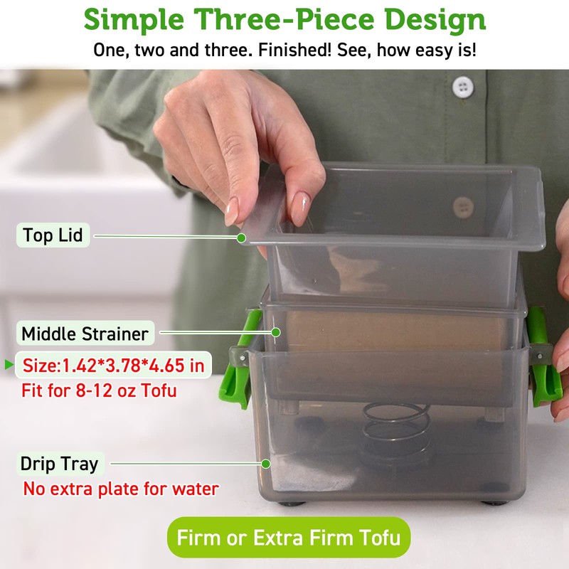 - ✅ EASY TO USE & NO MESS: Only contains 4 basic parts and Just in 3 steps. 1)Set up the spring in the Water Collecting Tray. 2)Put your tofu into the Middle Strainer;3)Cover with the Top Lid and lock Handles. When pressing, your tofu is in been put in the strainer box, which helps to keep its shape as intact, so it will not get mess.