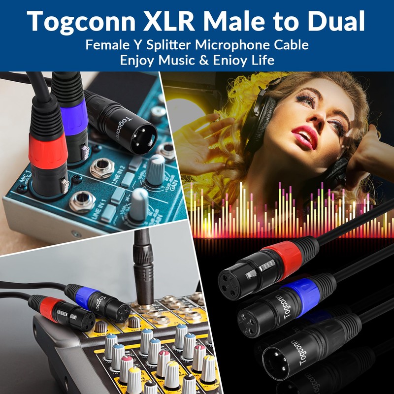 Togconn XLR Splitter Microphone Cable, XLR Male to Dual Female Y Splitter Adapter, XLR-M to Two XLR-F, 3-Pin Balanced Mic Connector Converter Cable-1 Feet