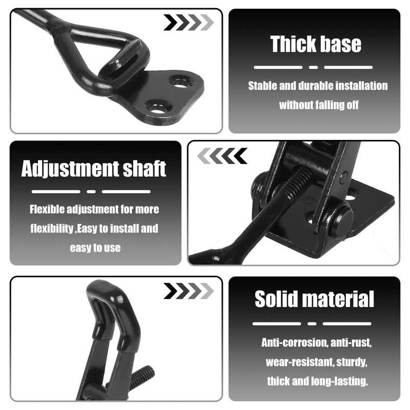 - High Quality Material: Adjustable toggle clamp latch is made of high quality iron material, sturdy and durable, black coating, rust-proof, higher strength, strong load-bearing shelves, not easy to deform. Suitable for indoor and outdoor environments with different temperatures