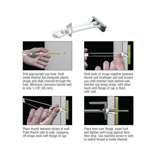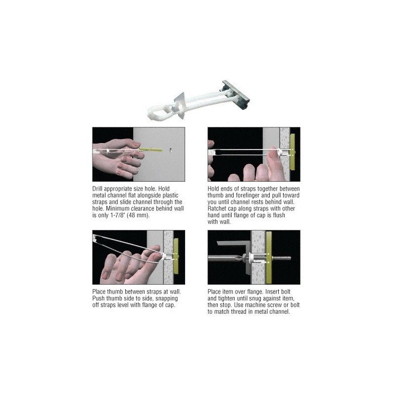 CRL SNAPTOGGLE® Toggle Anchors pre-install without a bolt and can be installed using a screw gun because the anchor won't spin in the hole. They also allow for bolt or fixture removal without the anchor falling behind the wall. SNAPTOGGLE® can be used in drywall, plaster, cement board, hollow walls of block, brick, stucco, fiberglass, and wood. NOTE: Bolts sold separately.