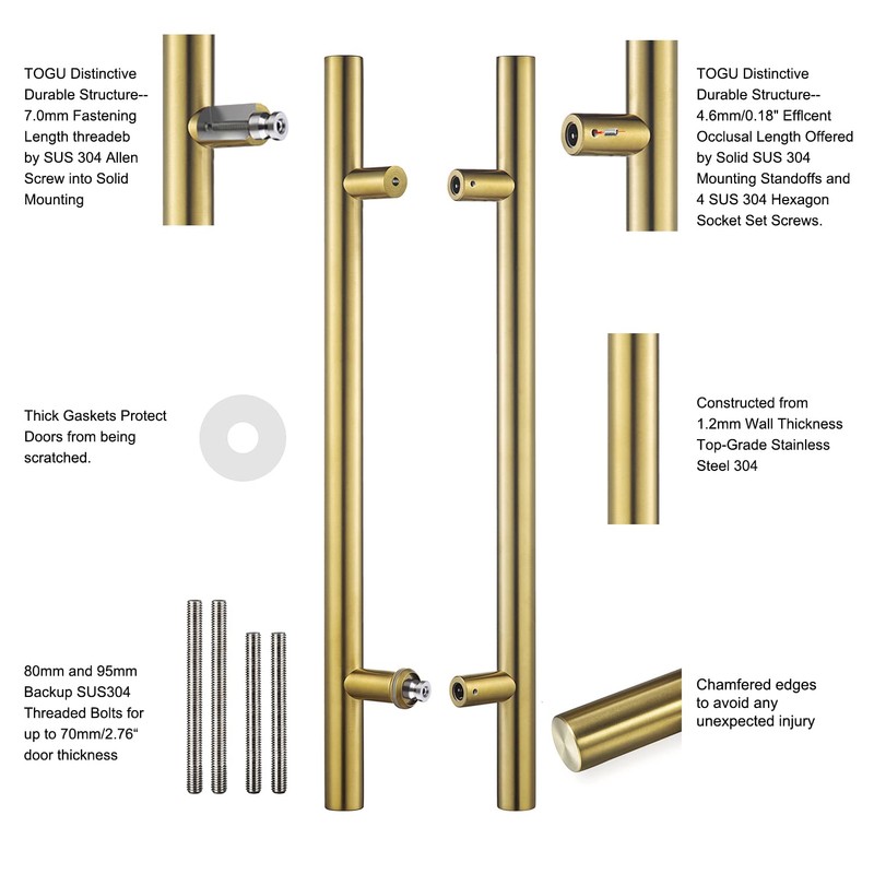 - HEAVY DUTY - Finished in perfect Satin gold with chamfered edges to avoid any unexpected accidental injury, TOGU TG-6012 12 inch inch size provides a door pull/handle length of 11.81 inch /300mm, hole to hole distance 7.87 inch/200mm, Solid mounting Standoffs Height 1.65 inch /42mm, Cross-Section Diameter 0.98 inch/25mm.The Net weight of the handle is 0.95 KG/2.09LB.