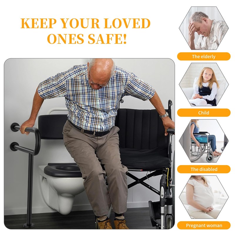 - Toilet safety rails widely use: Wall mount handicap grab bars is universal and can be used in many applications.Black toilet grab bars can be used in the bathroom, kitchen, along stairways, or in the laundry room for additional fall prevention.It’s not only apply to use as toilet handles for elderly and disabled,but also pregnant woman,injury and etc.