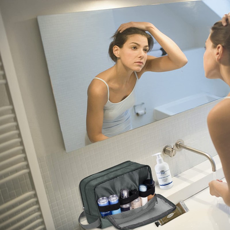 - 【ORGANIZED COMPARTMENTS】 --- Main compartment that holds larger items such as shampoo bottles or shaving cream. One zippered mesh pouch that keeps your smaller toiletries and cosmetics in a place visible and breathable. Other side front zipper pocket that provides extra storage with easy.