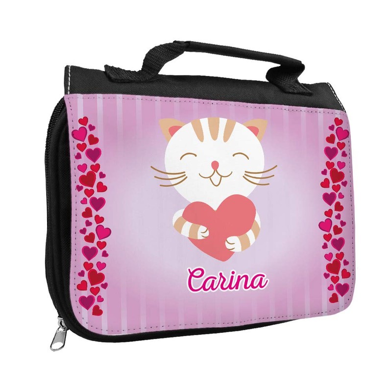 Toiletry Bag with Name Carina and Cat Motif with Hearts for Girls Toiletry Bag with First Name Wash Bag for Children