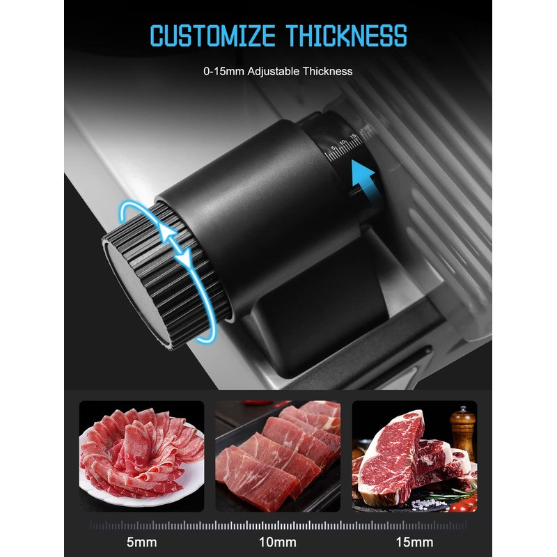 - Achieve Elite Kitchen: The food slicer cuts the food precisely, it makes you like a GOOD chef at home. Adjustable Thickness from super thin to approximately 3/4 Thick for slicing various of food such as meat, deli, cheese, roast beef, turkey Breast, vegetables and fruits.