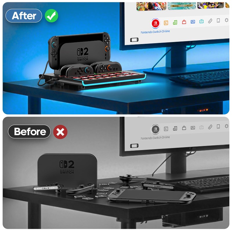 - Intelligent Chip Integration - Built in smart chip, this organizer base can safeguard against overcharge, overheating, overcurrent, and short circuits—keeping your Switch 2 and accessories safe. The storage station can also reduce energy waste and extend the lifespan of both the stand and your gear, saving you hassle in the long run.