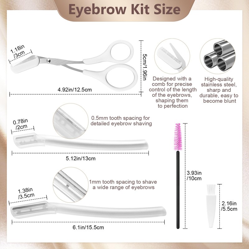 - 5 in 1 Set: This eyebrow kit contains one eyebrow scissors with comb, one long eyebrow razor, one short eyebrow razor, one spoolie brush and one cleaning brush for all your beautiful eyebrow and eyelash needs!
