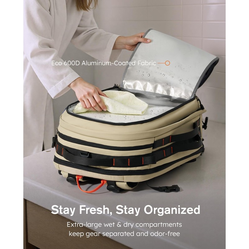 - ✅【Smart 8L Wet/Dry Storage】Tired of mixing damp clothes or used items with your clean gear while traveling? This travel backpack solves that with a dedicated wet/dry top compartment—perfect for storing gym wear, swimsuits, or rain-soaked items without affecting the rest of your belongings. With an expandable 40–45L capacity, it’s the perfect all-in-one solution for 3–5 day trips, keeping you prepared and organized wherever you go.