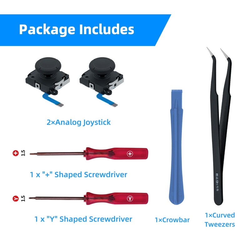 - Package includes: 2 x 3D analogue joysticks, 1 x "Y" screwdriver, 1 x "+" screwdriver, 1 x pry tool, 1 x tweezers.