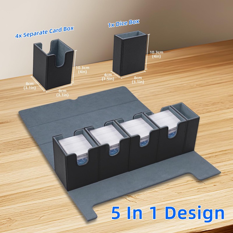 - Ideal gift for card collectors: you can take four separate decks, even for different games, anywhere. You can bring a Magic, YuGiOh!, Dragon Shield and Digimon deck with you to a friend's game night. The fifth compartment contains various markers and dice. If you are looking for a new storage solution for your cards and accessories on the market, this box is definitely worth considering.