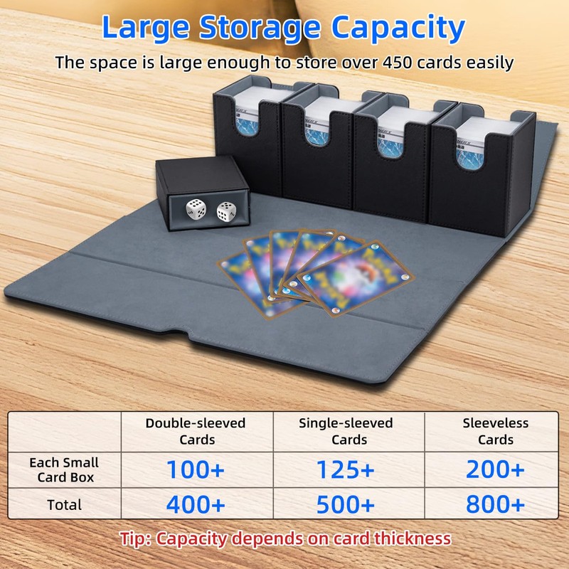 - Large capacity: this deck organiser is large enough to hold over 450 wrapped cards. Each single deck box can hold 100 double wrapped cards or 125 simply wrapped cards. This is a great way to take multiple decks along with dice and markers to any card game night. Please note that it works with double and single wrapped cards, but not with top loader sleeves. (Dice and card sleeves are not included)