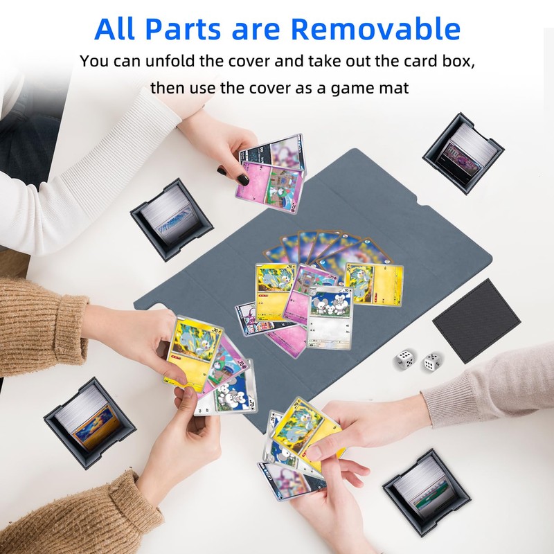 - Magnetic closure design: the magnets hold the card boxes in place and are strong enough to prevent slipping, but not so strong that it becomes difficult to loosen them. The small card box can be easily removed or assembled. You can roll out the lid and remove the deck boxes to have a mini play mat to play. It should be noted that the cube holder must stay in place as the magnets in this area are slightly different and will not hold other boxes.