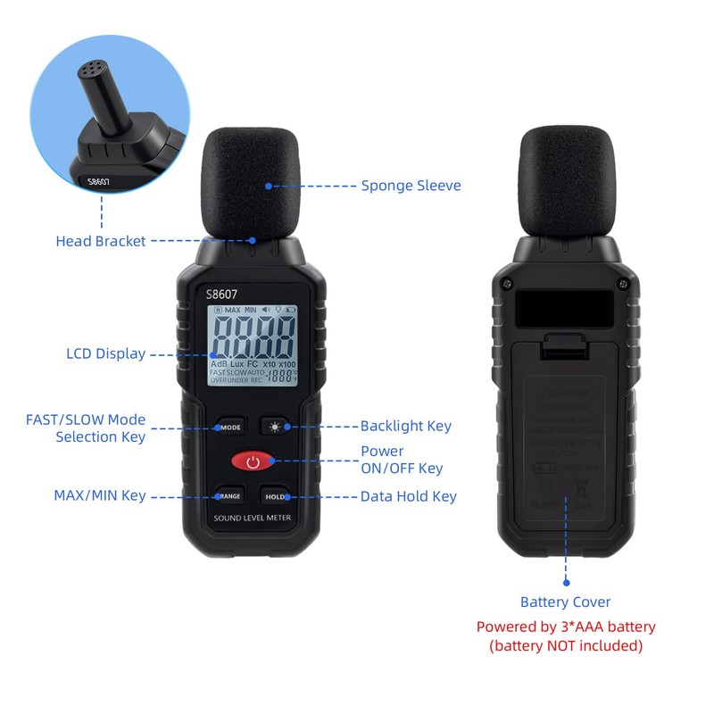 - Fast/slow response modes: by simply pressing the MODE button, users can switch between reaction speeds quickly and slowly. Fast mode is useful for real-time monitoring of different noise levels, while the SLOW mode provides averages that are ideal for stable noise environments. The decibel meter is powered by batteries (batteries not included) and has an automatic shut-off function to extend battery life. The screen also shows a low battery level so users can replace the batteries in time.