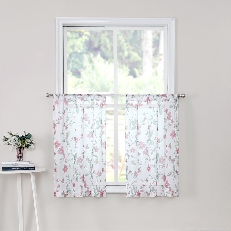 Tollpiz Short Sheer Floral Tier Curtains Pink Flower Butterfly Printed Half Window Curtain Rod Pocket Kitchen Voile Faux Linen Curtains for Bathroom, 30 x 24 inches Long, Set of 2 Panels