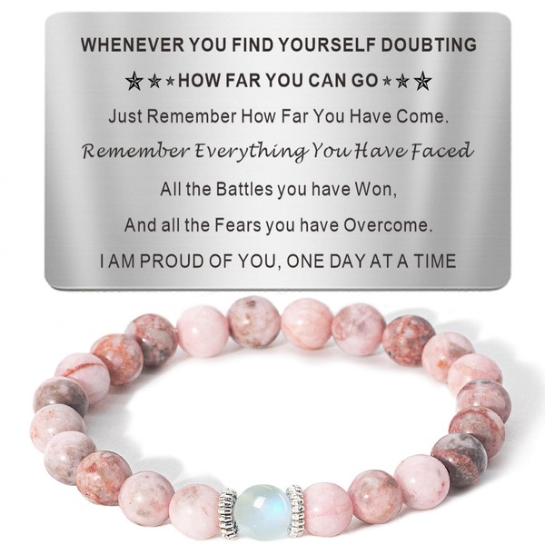 - 【Inspirational Gifts for Women】This Pink Zebra Jasper Moonstone bracelet with a inspirational sober wallet card definitely great gifts for women, come with a nice gift box that can be given as a gift directly. Wearing this healing bracelets is excellent to help Purify Stress or Anxiety, Bring her Love and Protection, Guides make Right Decisions, attract Good Fortune, brings her Powerful Strength, Courage and Confidence. womens best sobriety gifts